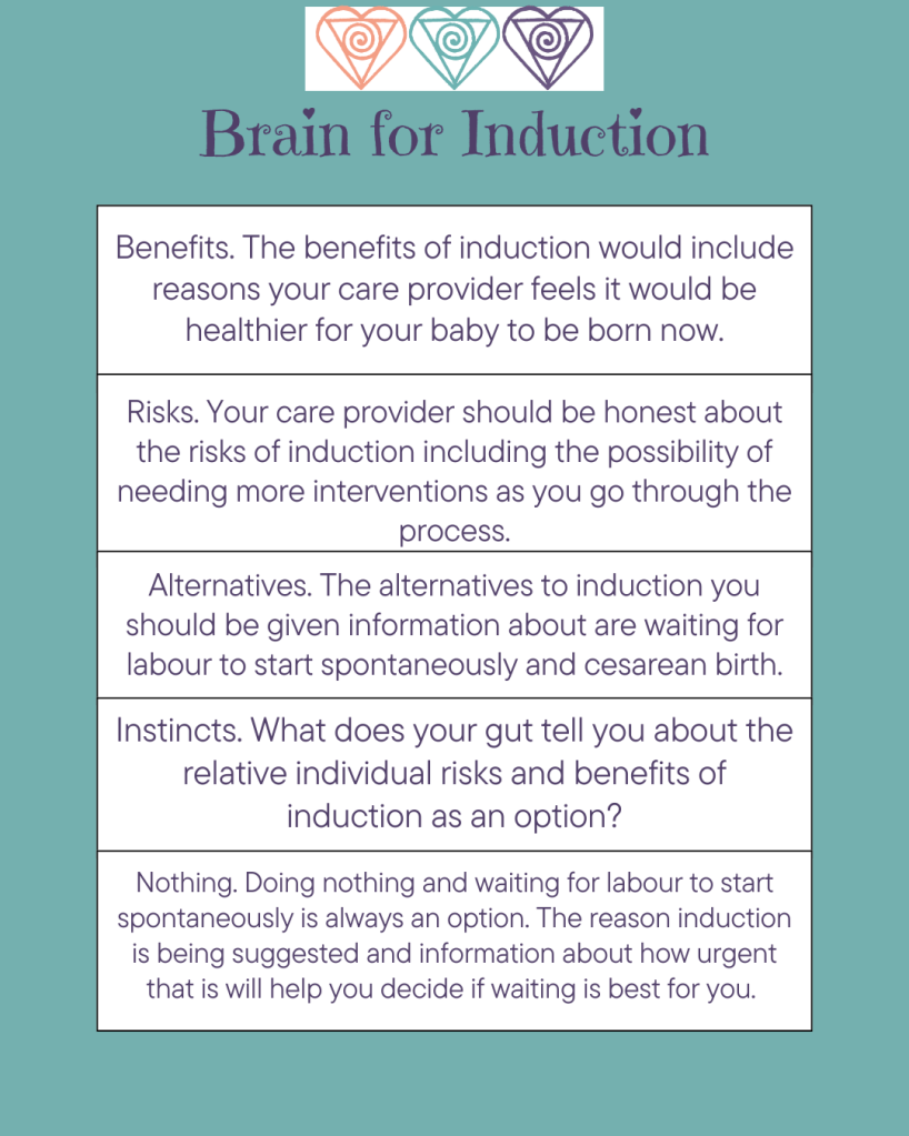 As with every intervention, induction of labour no matter how it’s presented is an offer and there are risks as well as benefits and alternatives you can choose if your instincts tell you, they would be better for you. The main alternatives are what’s called ‘expectant management’ – closer monitoring of your health and your baby’s health until spontaneous labour begins- or planned caesarean birth.